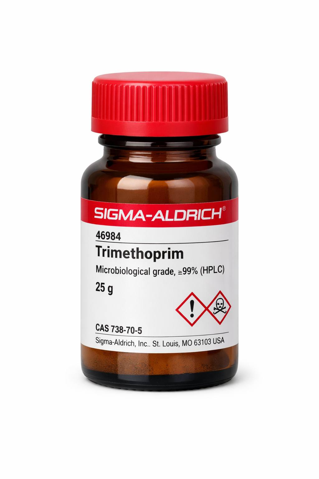 تری متوپریم سیگما آلدریچ با کد 46984 یک آنتیبیوتیک آزمایشگاهی با درجه خلوص بالا است که با نام شیمیایی۲,۴-دیآمینو-۵-(۳,۴,۵-تریمتوکسیبنزیل) پیریمیدین نیز شناخته میشود. این ماده با شماره CAS 738-70-5، یک مهارکننده انتخابی و قدرتمند آنزیمدیهیدروفولات ردوکتاز در باکتریها است که با اختلال در سنتز اسید فولیک، سنتز DNA و رشد باکتری را متوقف میکند.